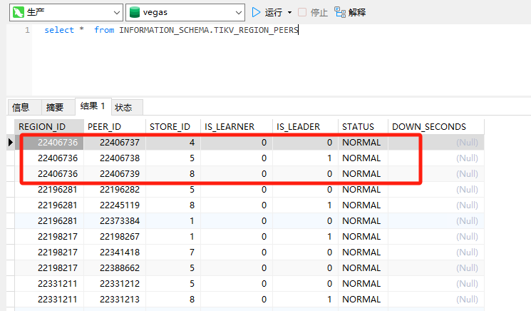 如图,3副本的默认设置,一个region有region_id,3个副本有3个peer_id,其中一个peer_id是leader角色,另外2个是follower角色,图中sotre_id指tikv的id,每个副本在哪个tikv上