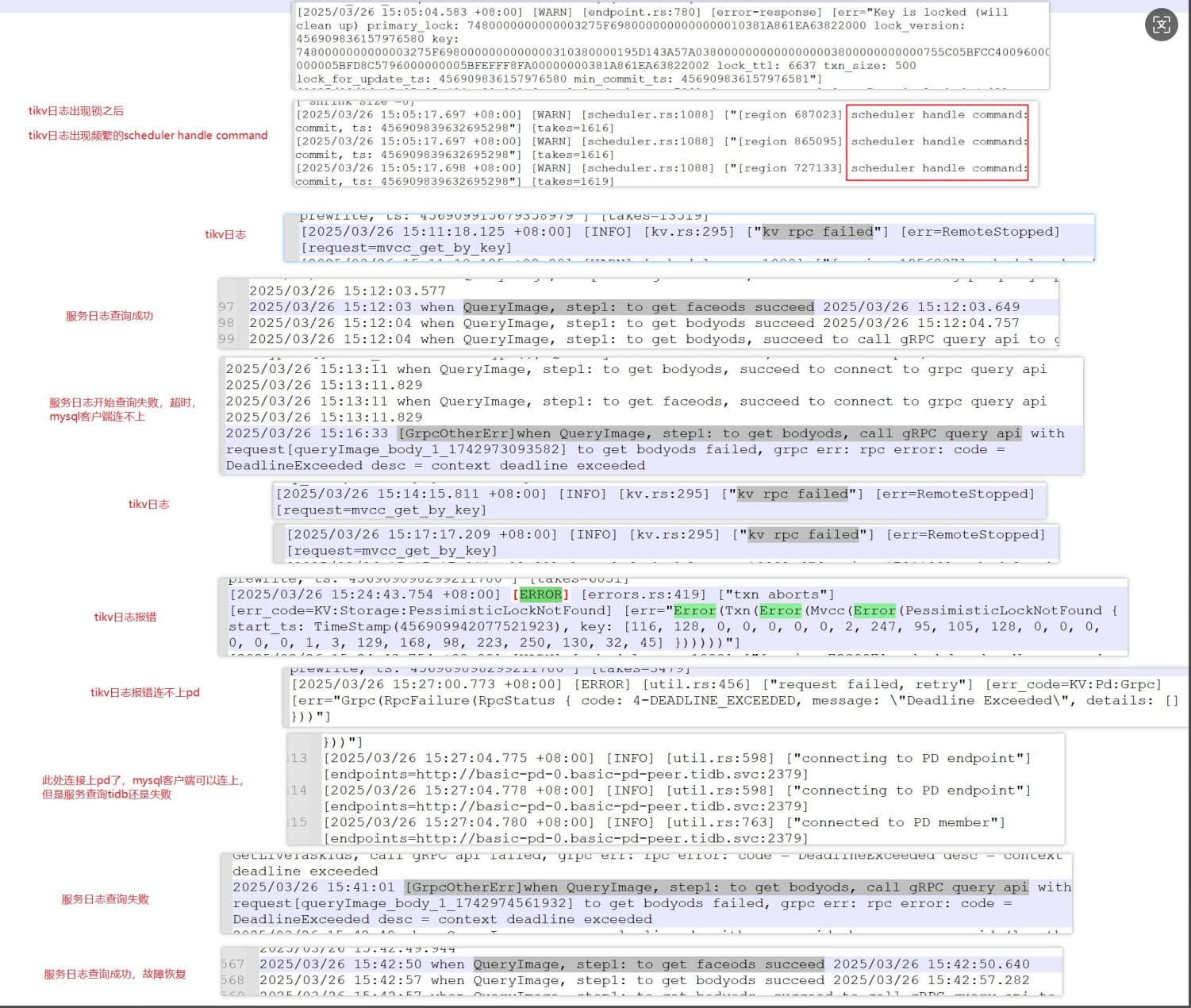 【遇到的问题:问题现象及影响】本次记录15:13分左右服务查询开始超时,到15:42查询成功期间的日志。现象mysql客户端连不上。服务查询报错超时,看tikv日志有大量scheduler handle command,然后15:27tikv日志报错请求pd失败,错误码是4-DEADLINE_EXCEEDED,在15:27:04成功连接上pd,mysql客户端可以连上,服务查询还是超时,直到15:42