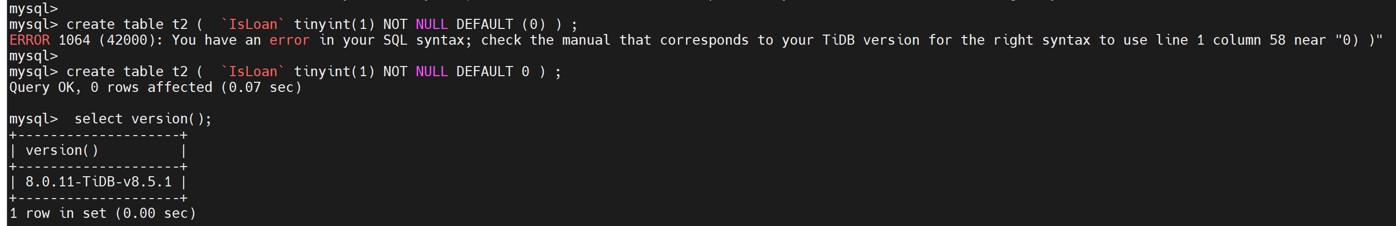 默认值上 () 的问题,去掉就行了,tidb 是不支持这种写法