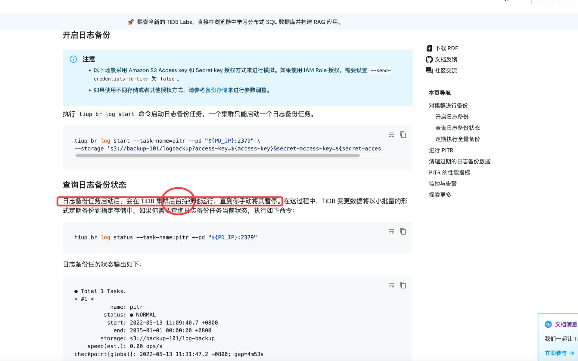 br日志备份是个后台任务,从你执行的那一刻起,一直监听tikv的变更情况,然后写到存储中例如s3