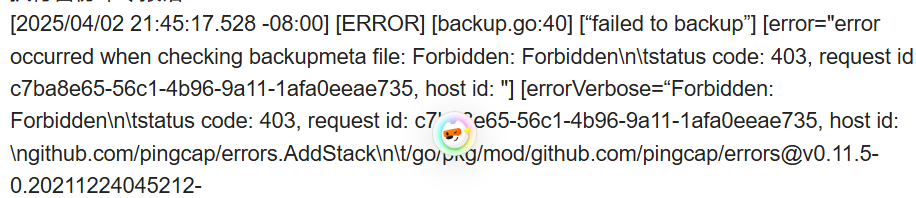 [2025/04/02 21:45:17.528 -08:00] [ERROR] [main.go:59] [“br failed”] [error="error occurred when checking backupmeta file: Forbidden: Forbidden\n\tstatus code: 403, request id: c7ba8e65-56c1-4b96-9a11-1afa0eeae735, host id: "] [errorVerbose=“Forbidden: Forbidden\n\tstatus code: 403, request id: c7ba8e65-56c1-4b96-9a11-1afa0eeae735, host id: \ngithub.com/pingcap/errors.AddStack\n\t/go/pkg/mod/github.com/pingcap/errors@v0.11.5-0.20211224045212-9687c2b0f87c/errors.go:174\ngithub.com/pingcap/errors.Trace\n\t/go/pkg/mod/github.com/pingcap/errors@v0.11.5-0.20211224045212-9687c2b0f87c/juju_adaptor.go:15\ngithub.com/pingcap/tidb/br/pkg/storage.(*S3Storage).FileExists\n\t/home/jenkins/agent/workspace/build-common/go/src/github.com/pingcap/br/br/pkg/storage/s3.go:457\ngithub.com/pingcap/tidb/br/pkg/backup.(*Client).SetStorage\n\t/home/jenkins/agent/workspace/build-common/go/src/github.com/pingcap/br/br/pkg/backup/client.go:181\ngithub.com/pingcap/tidb/br/pkg/task.RunBackup\n\t/home/jenkins/agent/workspace/build-common/go/src/github.com/pingcap/br/br/pkg/task/backup.go:284\nmain.runBackupCommand\n\t/home/jenkins/agent/workspace/build-common/go/src/github.com/pingcap/br/br/cmd/br/backup.go:39\nmain.newDBBackupCommand.func1\n\t/home/jenkins/agent/workspace/build-common/go/src/github.com/pingcap/br/br/cmd/br/backup.go:122\ngithub.com/spf13/cobra.(*Command).execute\n\t/go/pkg/mod/github.com/spf13/cobra@v1.4.0/command.go:856\ngithub.com/spf13/cobra.(*Command).ExecuteC\n\t/go/pkg/mod/github.com/spf13/cobra@v1.4.0/command.go:974\ngithub.com/spf13/cobra.(*Command).Execute\n\t/go/pkg/mod/github.com/spf13/cobra@v1.4.0/command.go:902\nmain.main\n\t/home/jenkins/agent/workspace/build-common/go/src/github.com/pingcap/br/br/cmd/br/main.go:57\nruntime.main\n\t/usr/local/go/src/runtime/proc.go:250\nruntime.goexit\n\t/usr/local/go/src/runtime/asm_amd64.s:1571\nerror occurred when checking backupmeta file”] [stack=“main.main\n\t/home/jenkins/agent/workspace/build-common/go/src/github.com/pingcap/br/br/cmd/br/main.go:59\nruntime.main\n\t/usr/local/go/src/runtime/proc.go:250”]