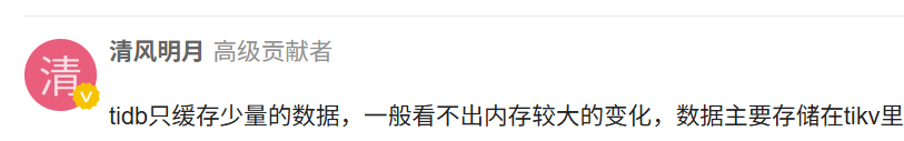 tidb只缓存少量的数据,一般看不出内存较大的变化,数据主要存储在tikv里。