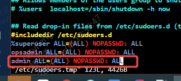 admin ALL=(ALL) NOPASSWD: ALL