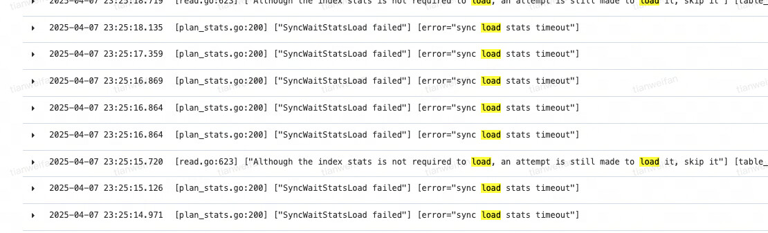 [handle_hist.go:125] [“SyncWaitStatsLoad meets error”] [errors="["sync load took too long to return","sync load took too long to return","sync load took too long to return","sync load took too long to return","sync load took too long to return","sync load took too long to return","sync load took too long to return","sync load took too long to return","sync load took too long to return","sync load took too long to return","sync load took too long to return","sync load took too long to return","sync load took too long to return","sync load took too long to return","sync load took too long to return","sync load took too long to return","sync load took too long to return","sync load took too long to return","sync load took too long to return","sync load took too long to return","sync load stats channel is full and timeout sending task to channel","sync load stats channel is full and timeout sending task to channel","sync load stats channel is full and timeout sending task to channel","sync load took too long to return","sync load stats channel is full and timeout