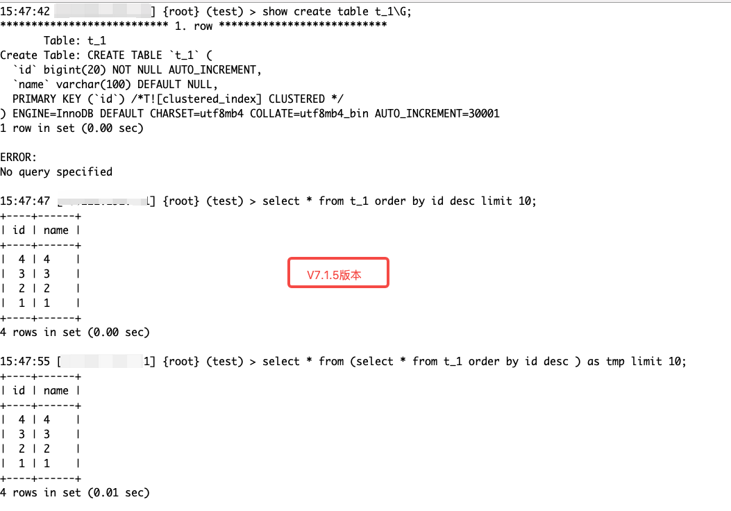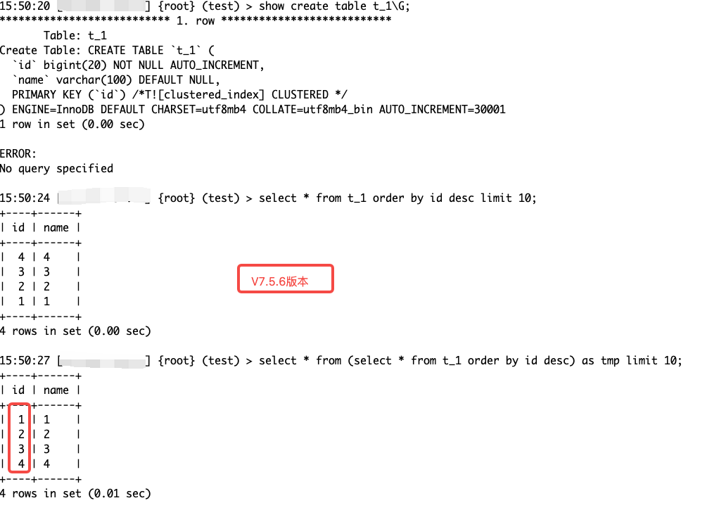 执行以下语句,不同版本得到的结果集不相同 ,v5.3.0与v7.1.5版本符合预期,v7.5.6不符合预期。