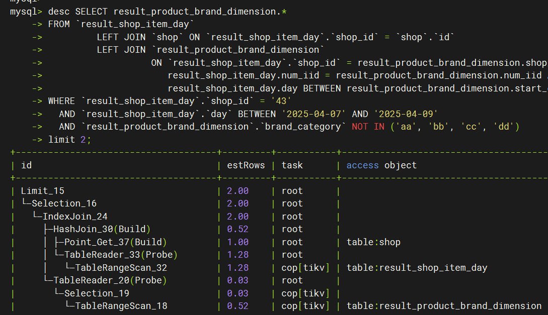 SELECT ANY_VALUE(IFNULL(`subQuery1138444`.`d1138444_99516018`, "")) as `p701110_99516018` FROM `result_shop_item_day` LEFT JOIN (SELECT tmp_table_inside.* FROM (SELECT result_shop_item_day.num_iid, sum(`result_shop_item_day`.`pay_amount`) AS top_amount, ROW_NUMBER() OVER ( ORDER BY SUM(result_shop_item_day.pay_amount) DESC) AS d1138444_99516018 FROM `result_shop_item_day` LEFT JOIN `shop` ON `result_shop_item_day`.`shop_id` = `shop`.`id` LEFT JOIN `result_product_brand_dimension` ON `result_shop_item_day`.`shop_id` = result_product_brand_dimension.shop_id AND result_shop_item_day.num_iid = result_product_brand_dimension.num_iid AND result_shop_item_day.day BETWEEN result_product_brand_dimension.start_date AND result_product_brand_dimension.end_date LEFT JOIN `m4_product_master_final` ON `result_shop_item_day`.`shop_id` = m4_product_master_final.shop_id and result_shop_item_day.num_iid = m4_product_master_final.num_iid LEFT JOIN `dim_day` ON `result_shop_item_day`.`brand_id` = dim_day.brand_id and result_shop_item_day.day = dim_day.day WHERE `result_shop_item_day`.`day` BETWEEN '2025-04-07' AND '2025-04-09' AND `result_shop_item_day`.`shop_id` = '43' AND `result_product_brand_dimension`.`brand_category` NOT IN ('购物金', '券', '邮费', '其他') AND (`result_shop_item_day`.`pay_amount` >= 0) GROUP BY `result_shop_item_day`.`num_iid`) tmp_table_inside) subQuery1138444 ON `result_shop_item_day`.`num_iid` = `subQuery1138444`.`num_iid` LEFT JOIN `shop` ON `result_shop_item_day`.`shop_id` = `shop`.`id` LEFT JOIN `result_product_brand_dimension` ON `result_shop_item_day`.`shop_id` = result_product_brand_dimension.shop_id AND result_shop_item_day.num_iid = result_product_brand_dimension.num_iid AND result_shop_item_day.day BETWEEN result_product_brand_dimension.start_date AND result_product_brand_dimension.end_date WHERE `result_shop_item_day`.`shop_id` = '43' AND `result_shop_item_day`.`day` BETWEEN '2025-04-07' AND '2025-04-09' AND `result_product_brand_dimension`.`brand_category` NOT IN ('购物金', '券', '邮费', '其他') GROUP BY IFNULL(subQuery1138444.d1138444_99516018, '') LIMIT 0,500000