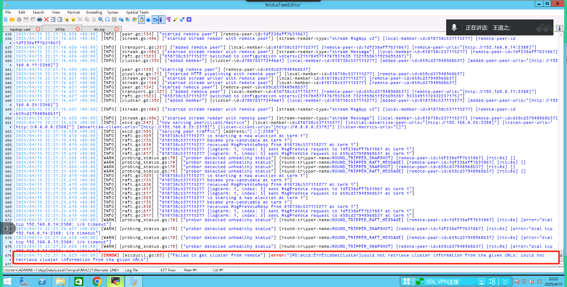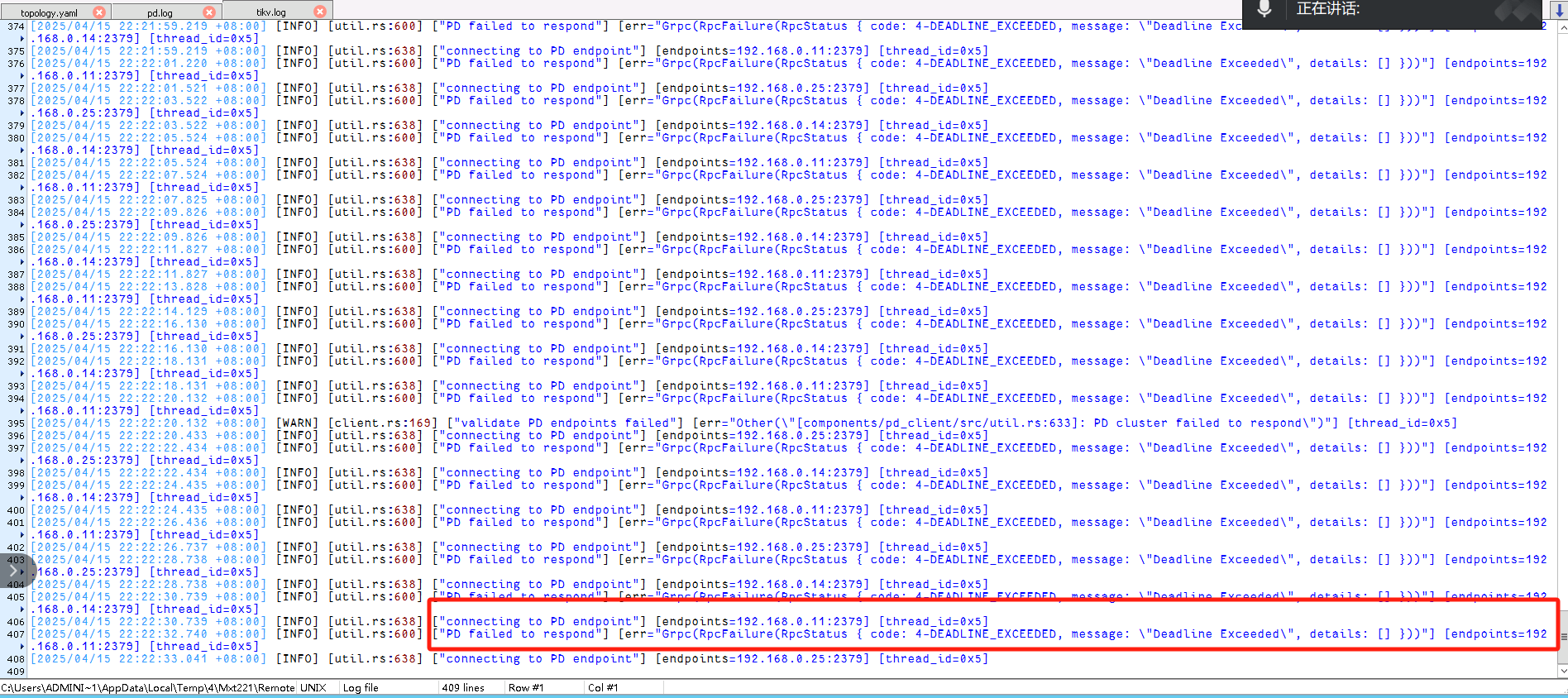 【遇到的问题:问题现象及影响】deploy集群后,启动集群时tikv无法启动,tikv日志显示pd无响应,pd日志报错如下