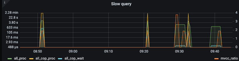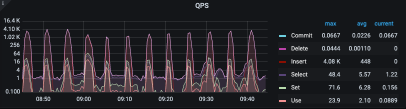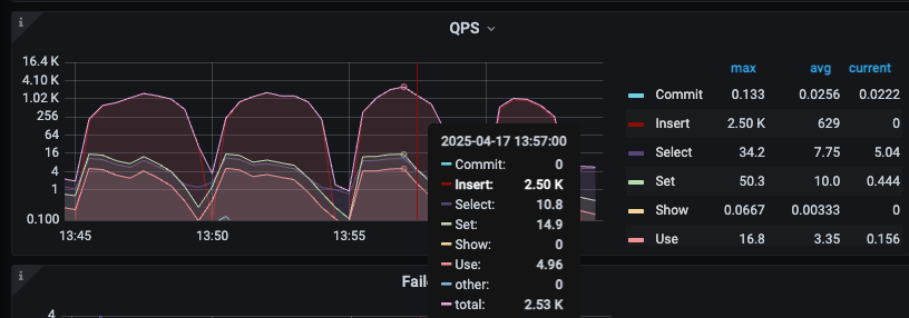 这个集群从监控看不是一直都有慢查询,流量比较小,CPS 和QPS 都是波段式的,有时候查询都没有的