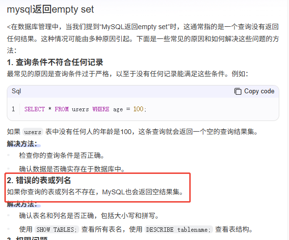 AI给出的答案,表不存在的时候也会返回Empty set