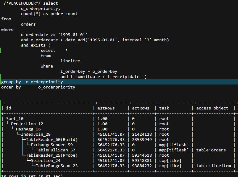 tpch 1000sf Q4 测试时未选择tiflash,2张表都有tiflash,全走tiflash 需要24秒,而走tikv要4分多钟