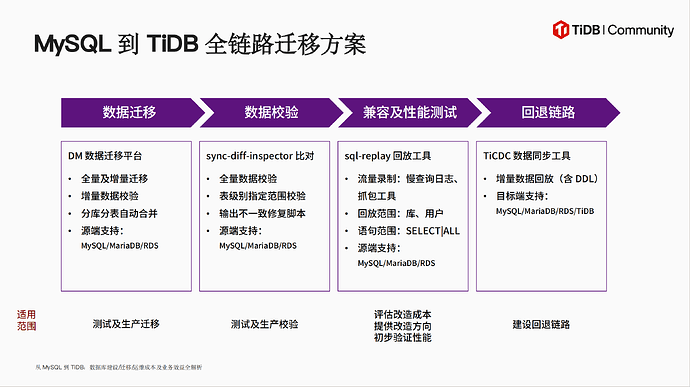 迁移实施方面,TiDB 提供全链路工具支持:DM 平台完成数据迁移,sync-diff-inspector 确保数据一致性,sql-replay 工具将测试周期从2周缩短至2天,配合 TiCDC 构建完整回退机制。上线后,TiDB 通过在线 DDL、闪回查询等功能显著降低运维复杂度,其丰富的工具箱大幅提升运维体验。