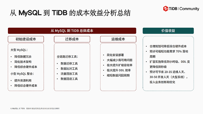 成本效益分析显示,TiDB 可降低30%硬件成本,预计减少20-35个运维人天。典型案例中,通过多业务合并实现机器使用量减少50%,数据同步通道精简80%。综合来看,TiDB 在建设成本、迁移风险和运维效率三个维度具有显著优势,为快速增长企业提供了更优的数据库解决方案。