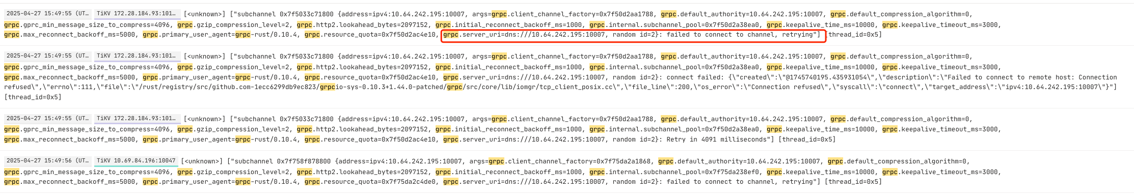 [] [“subchannel 0x7f5033c71800 {address=ipv4::10007, args=grpc.client_channel_factory=0x7f50d2aa1788, grpc.default_authority=:10007, grpc.default_compression_algorithm=0, grpc.gprc_min_message_size_to_compress=4096, grpc.gzip_compression_level=2, grpc.http2.lookahead_bytes=2097152, grpc.initial_reconnect_backoff_ms=1000, grpc.internal.subchannel_pool=0x7f50d2a38ea0, grpc.keepalive_time_ms=10000, grpc.keepalive_timeout_ms=3000, grpc.max_reconnect_backoff_ms=5000, grpc.primary_user_agent=grpc-rust/0.10.4, grpc.resource_quota=0x7f50d2ac4e10, grpc.server_uri=dns:///****:10007, random id=2}: failed to connect to channel, retrying”] [thread_id=0x5]