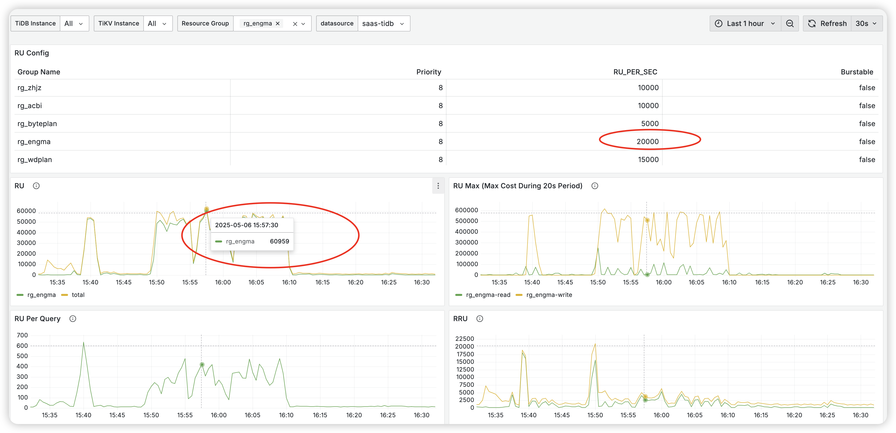资源组限制为20000,实际监控显示超过60000,导致tikv内存使用超过上限,tikv节点陆续重启,如下图资源组监控: