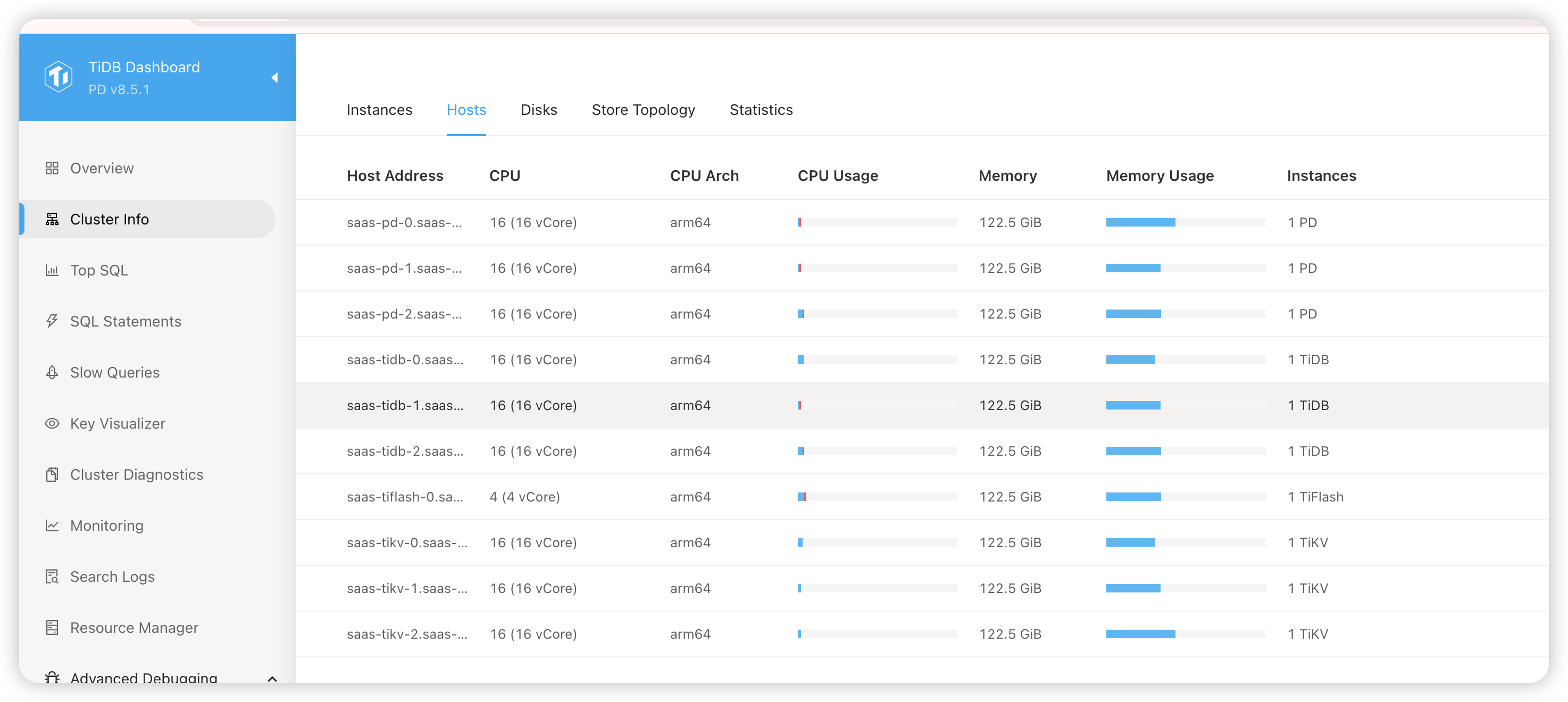 【资源配置】进入到 TiDB Dashboard -集群信息 (Cluster Info) -主机(Hosts) 截图此页面