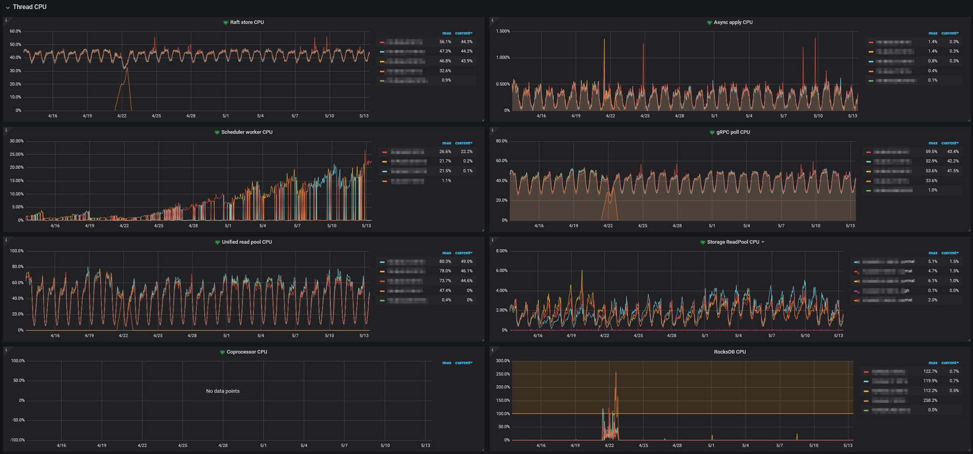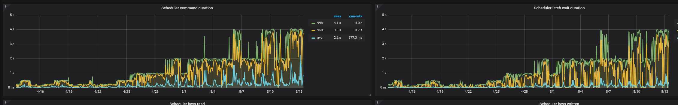 根据上图的提示看了对应的监控,发现Scheduler command duration和Scheduler latch wait duration都好几秒,感觉有点不正常。
