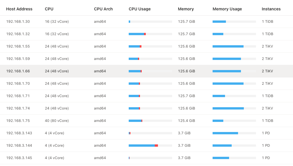 【资源配置】进入到 TiDB Dashboard -集群信息 (Cluster Info) -主机(Hosts) 截图此页面