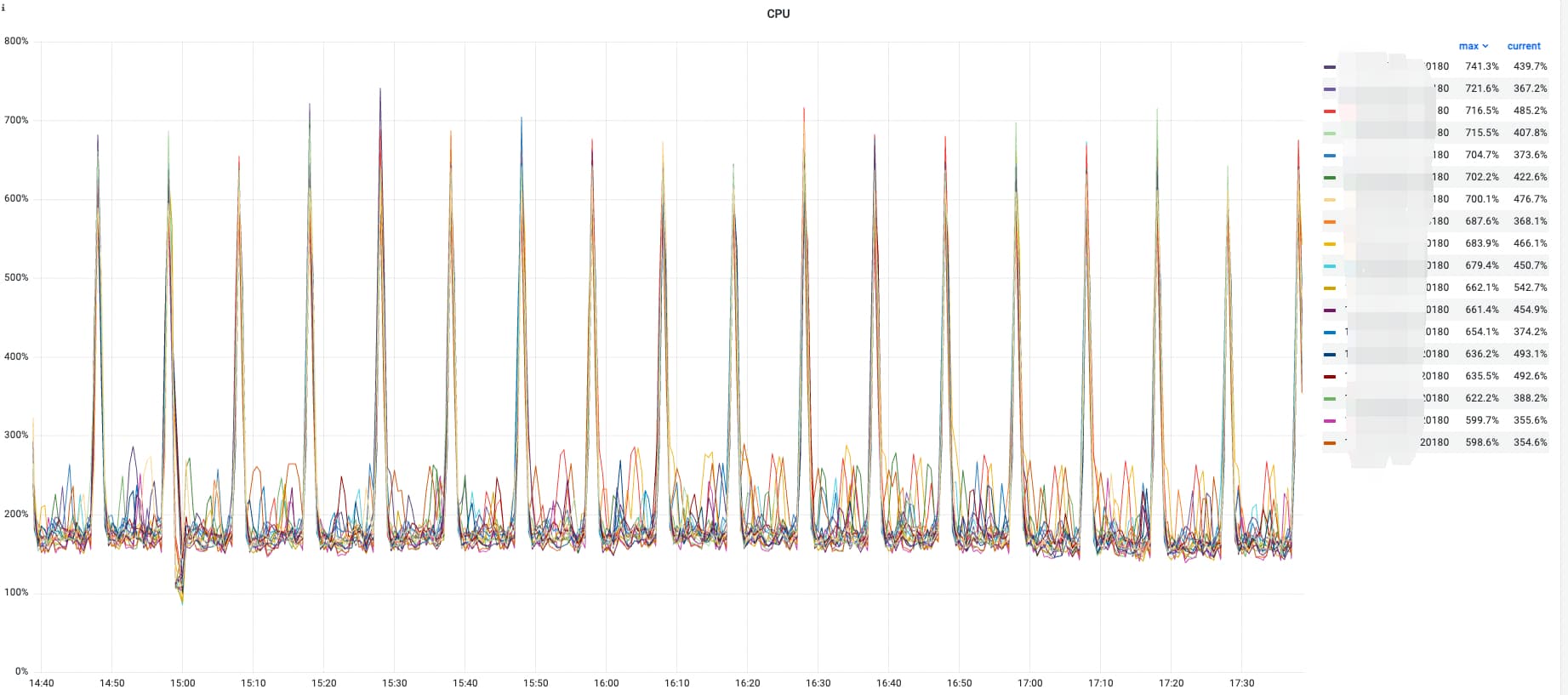 tikv节点为16C64G2T规格,每次gc都是导致CPU飙升到700%。业务正常使用CPU为200%。