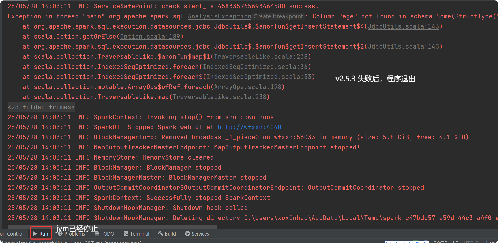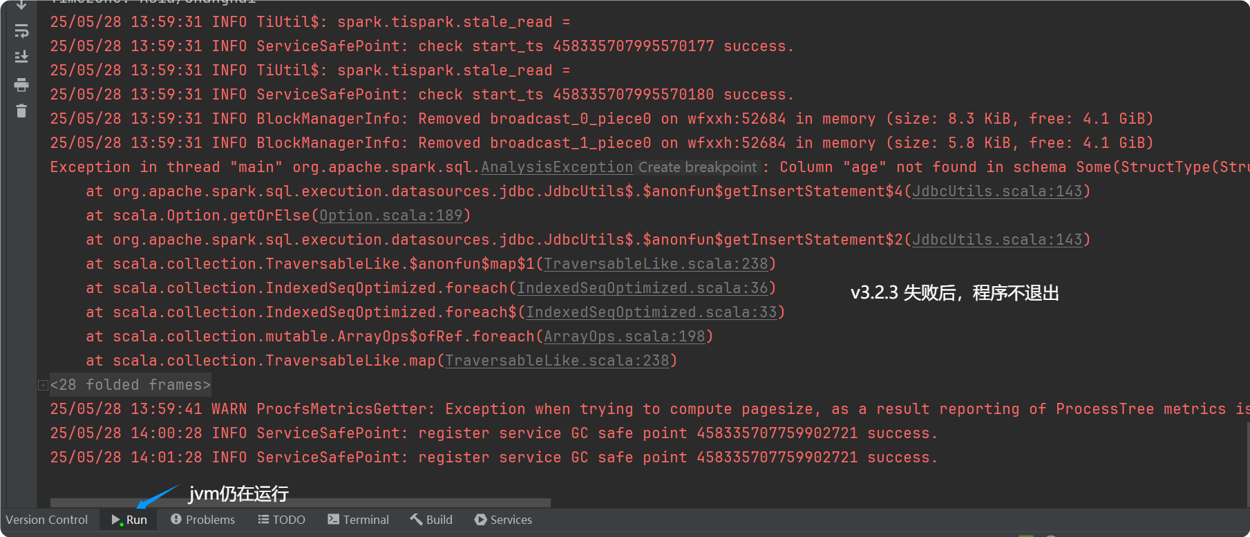 tispark version: 3.1-2.5.3 失败后会报错然后退出 3.1_2.12-3.0.3 失败后不会退出 3.1_2.12-3.1.7 失败后会报错然后退出 3.1_2.12-3.2.3 失败后不会退出