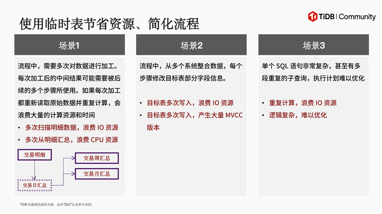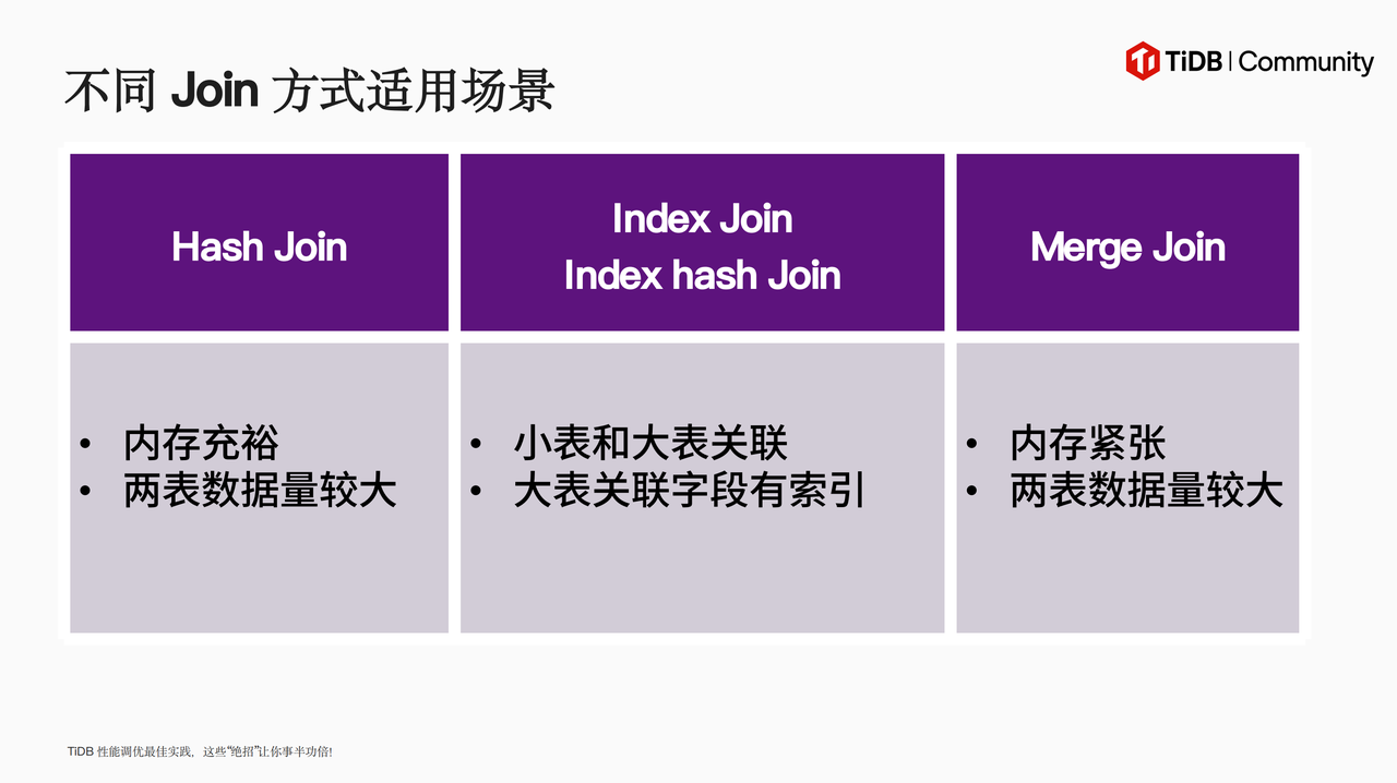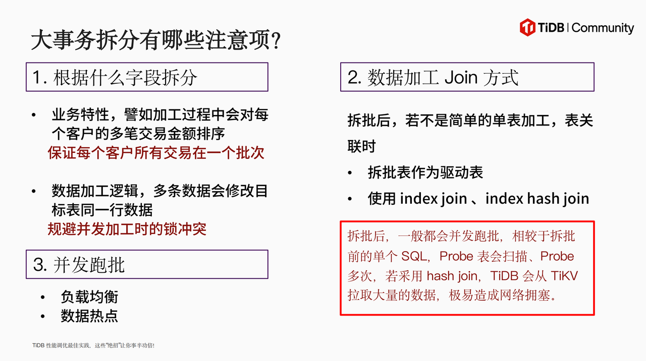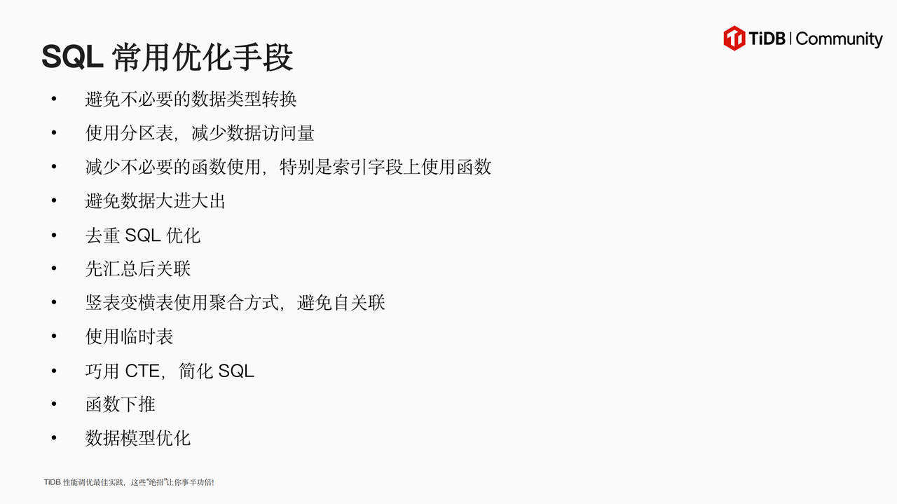 TiDB vs MySQL 系列第四期线上 Meetup,我们邀请了 TiDB 高级售后顾问谢泽群老师和大家分享了 70多页 TiDB 性能优化相关干货,涵盖 TiDB SQL 优化思路、工具、脚本,以及如何规避热点问题、不同 Join 方式适用场景、大事务拆分、资源管控等实践指南内容。