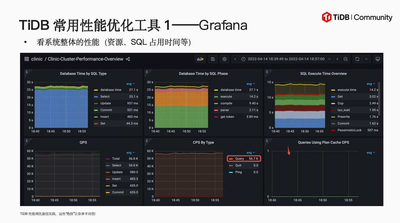 谢老师从 TiDB 性能优化思路开启本次分享,介绍了建立性能基线需要采集的各项性能数据,并向大家安利了两个 TiDB 性能优化工具 Grafana(用于查看系统整体性能)、Dashboard(用于定位优化对象)。