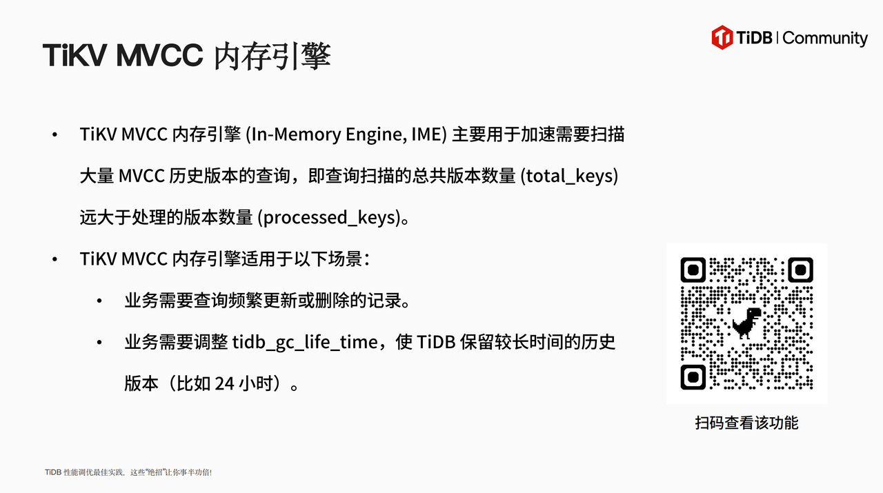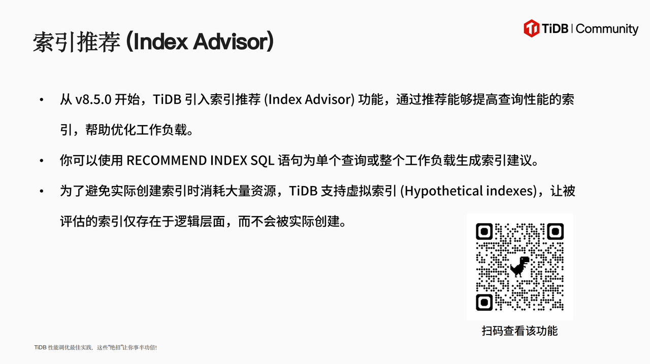 最后,关于数据导出以及如何用好 TiDB 资源管控特性,谢老师也给出了非常具有实操价值的建议,并向大家安利了 TiKV MVCC 内存引擎、TiDB 索引推荐(Index Advisor)功能。