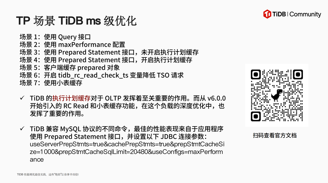 对于如何实现 TP 场景 TiDB ms 级优化、TiDB 批量场景性能优化,谢老师也分享了相关文档资料,帮助大家更好地应对不同运行场景下的性能分析和优化过程。