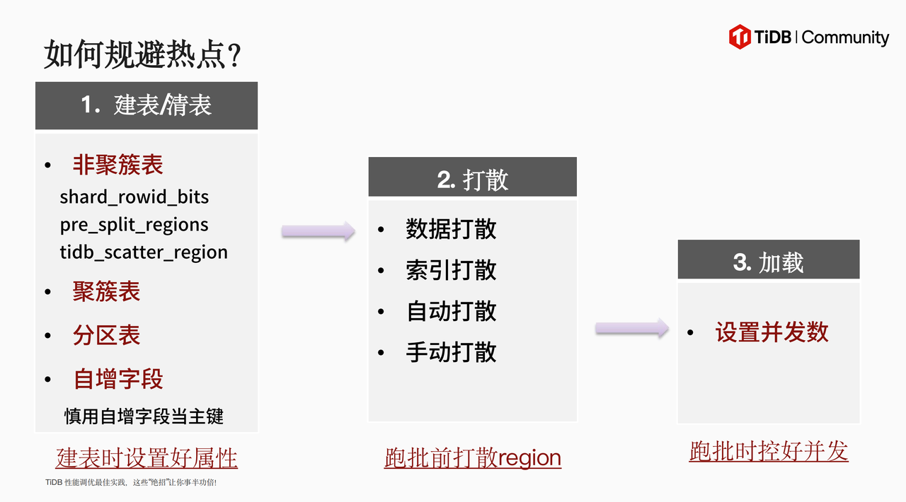 AP 场景数据加工流程第一步:文件入库。分享中介绍了 TiDB 数据导入三大工具(load data、lightning、import into)可以帮助大家让文件入库更丝滑。针对数据导入热点问题,谢老师从热点形成原因与如何规避热点两大角度进行解答,通过建表/清表、打散、加载的“三步走思路”,提升并发加载速度。