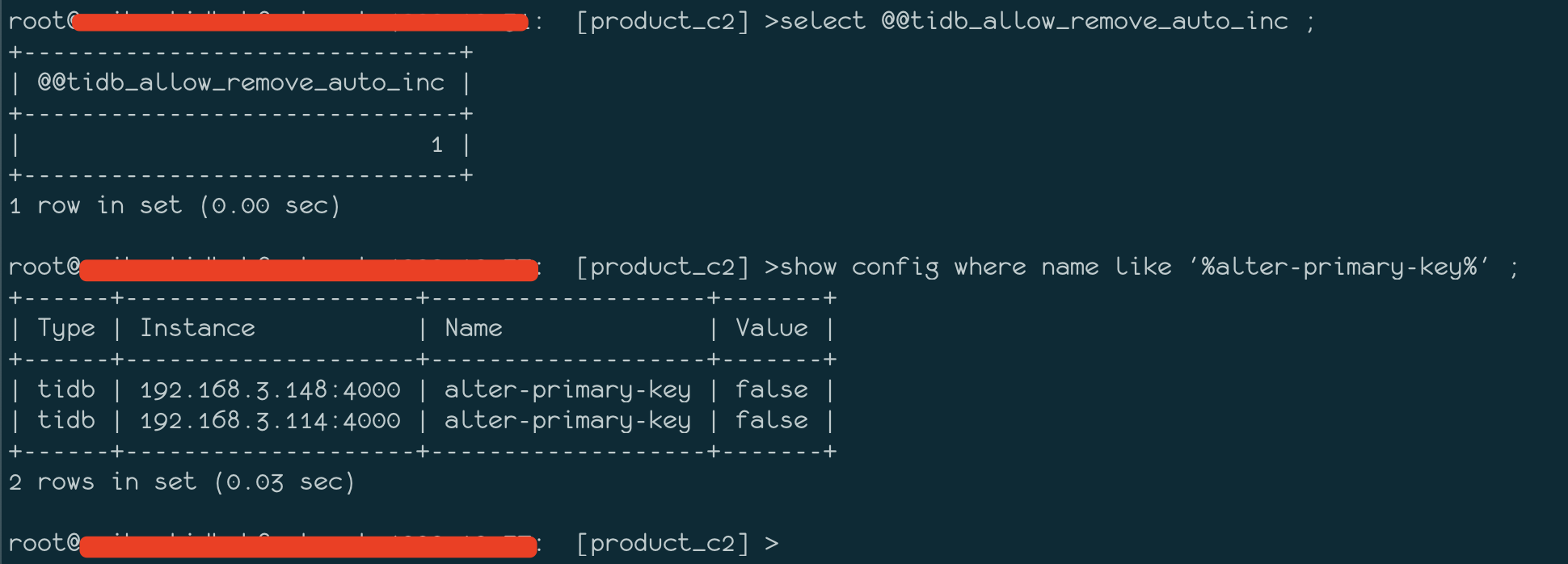 其中 tidb_allow_remove_auto_inc 和 alter-primary-key 参数都已满足要求