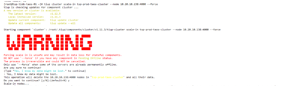 上面截图,就是tiup cluster scale-in prod-cluster -N ip:4000–force 时, 卡住了。估计这个stoppng 操作是需要登录机器,停掉 tidb-server 服务,但是现在这个机器登录不了了。