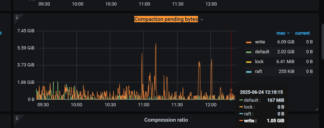 不是很高,除非盘很差,否则可以排除是compaction pending bytes的问题。