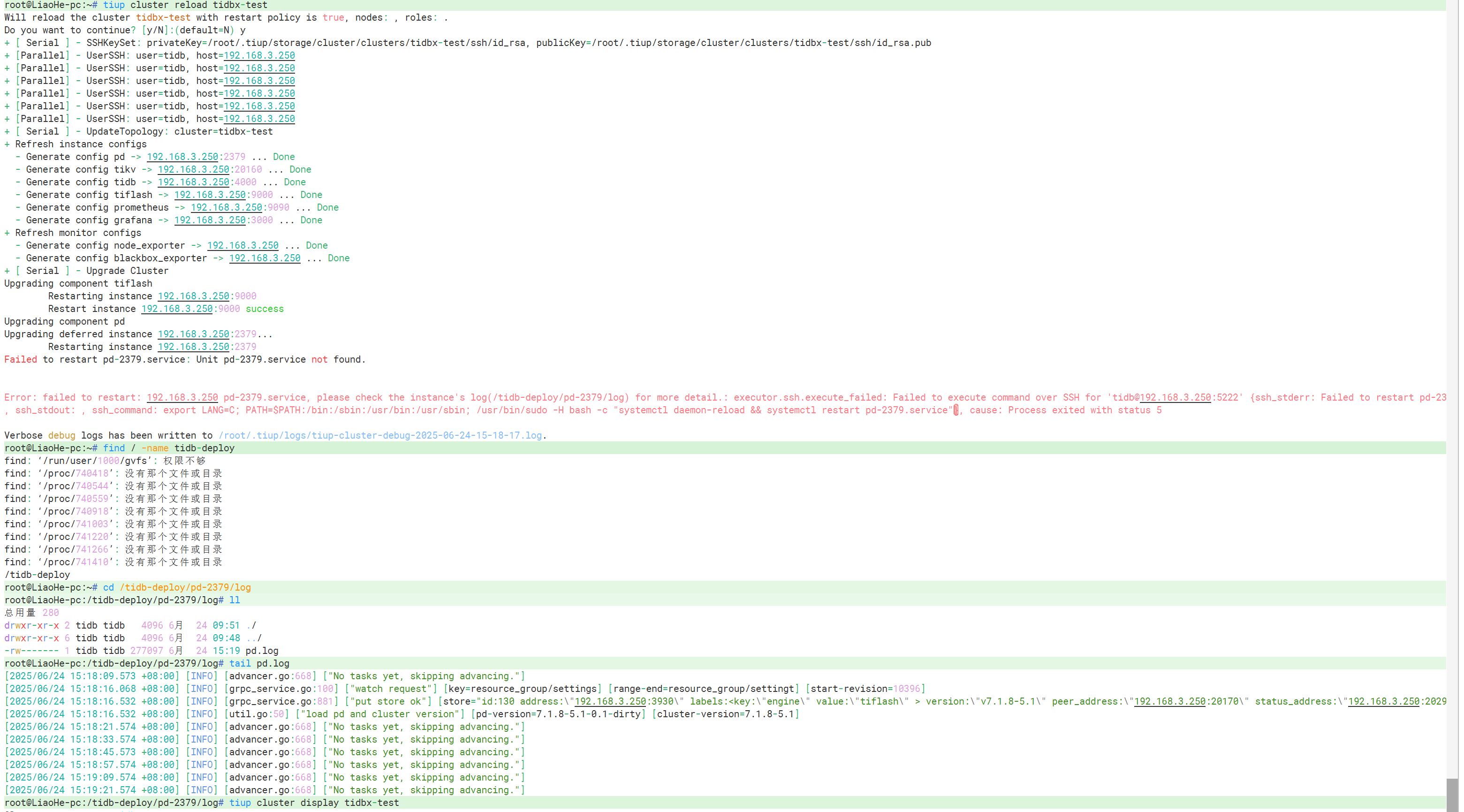 Error: failed to restart: 192.168.3.250 pd-2379.service, please check the instance’s log(/tidb-deploy/pd-2379/log) for more detail.: executor.ssh.execute_failed: Failed to execute command over SSH for ‘tidb@192.168.3.250:5222’ {ssh_stderr: Failed to restart pd-2379.service: Unit pd-2379.service not found.