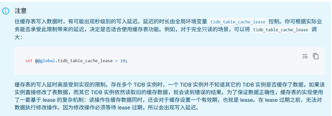 tidb_table_cache_lease这个值就是缓存表的租约时间,理论上你修改一张缓存表,最长可能等待这么长的时间。