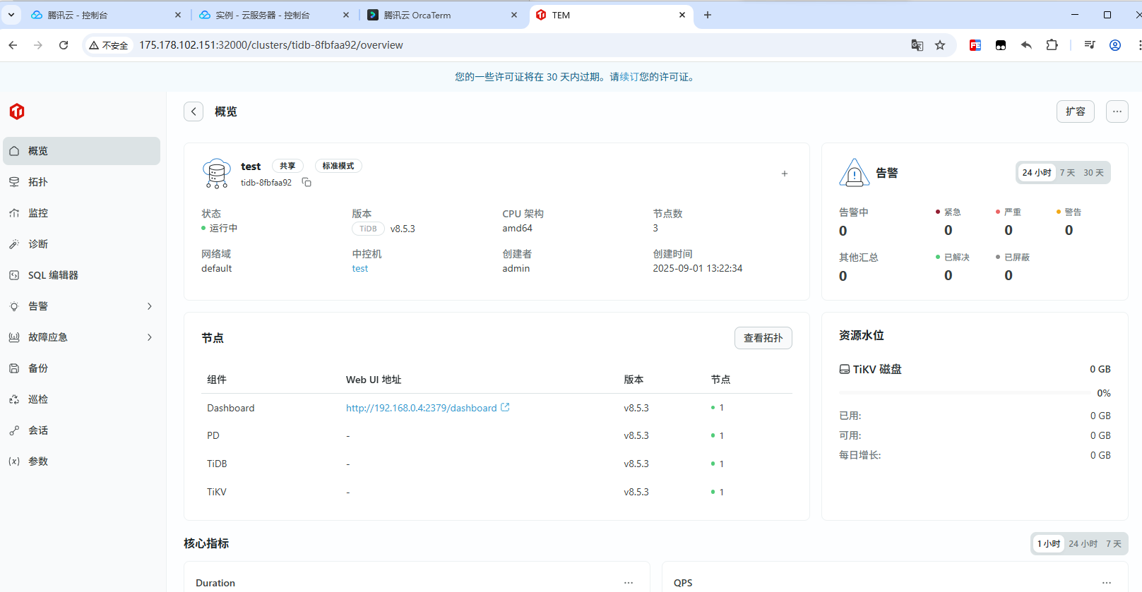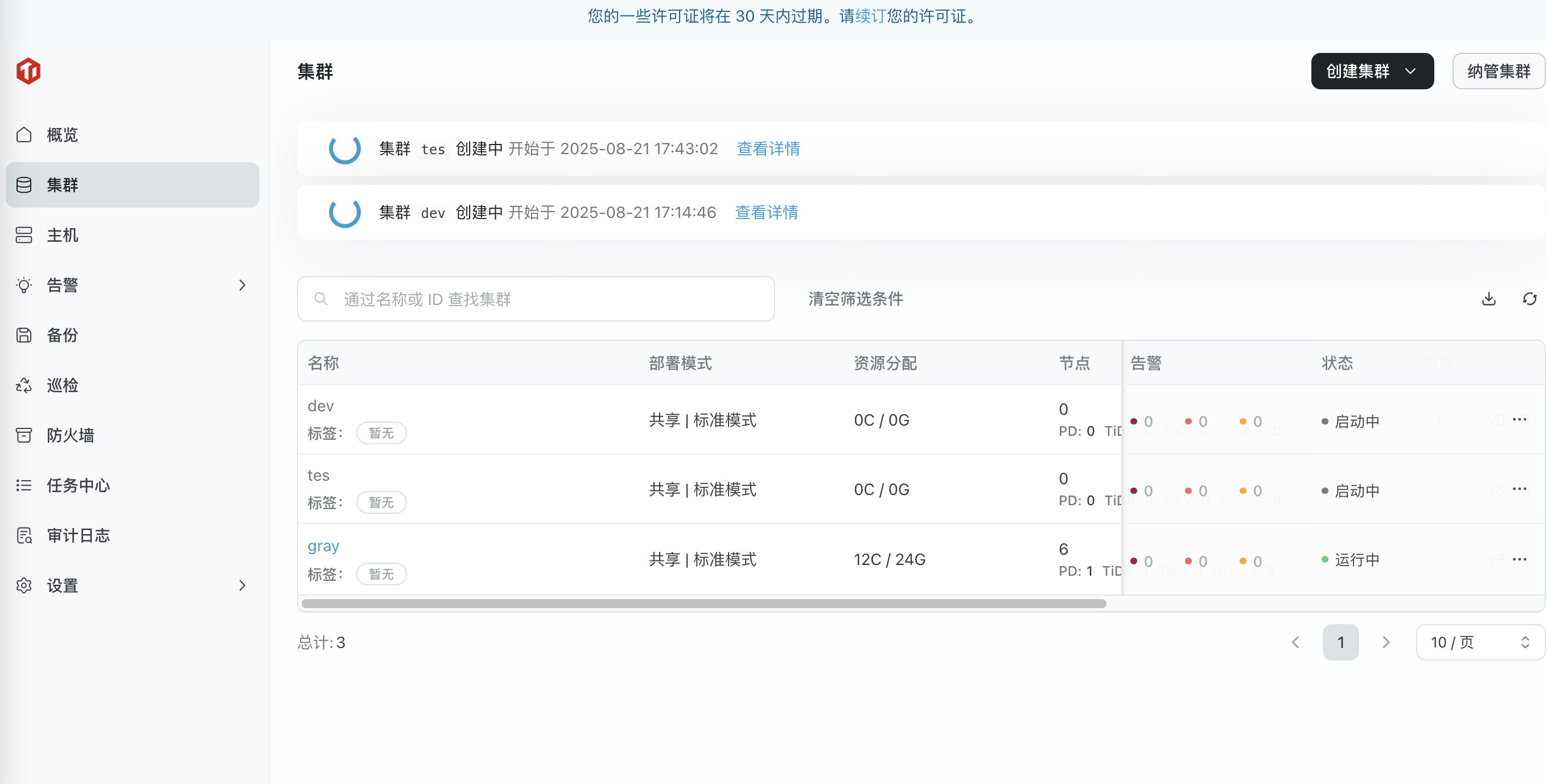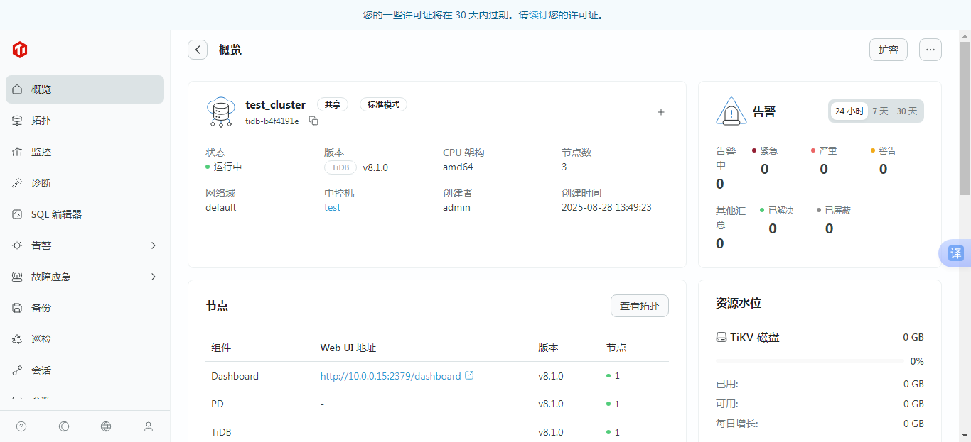 装了三遍集群(1运行中,2未初始化成功),终于成功了,可视化界面直观、日志清晰、报警准确。