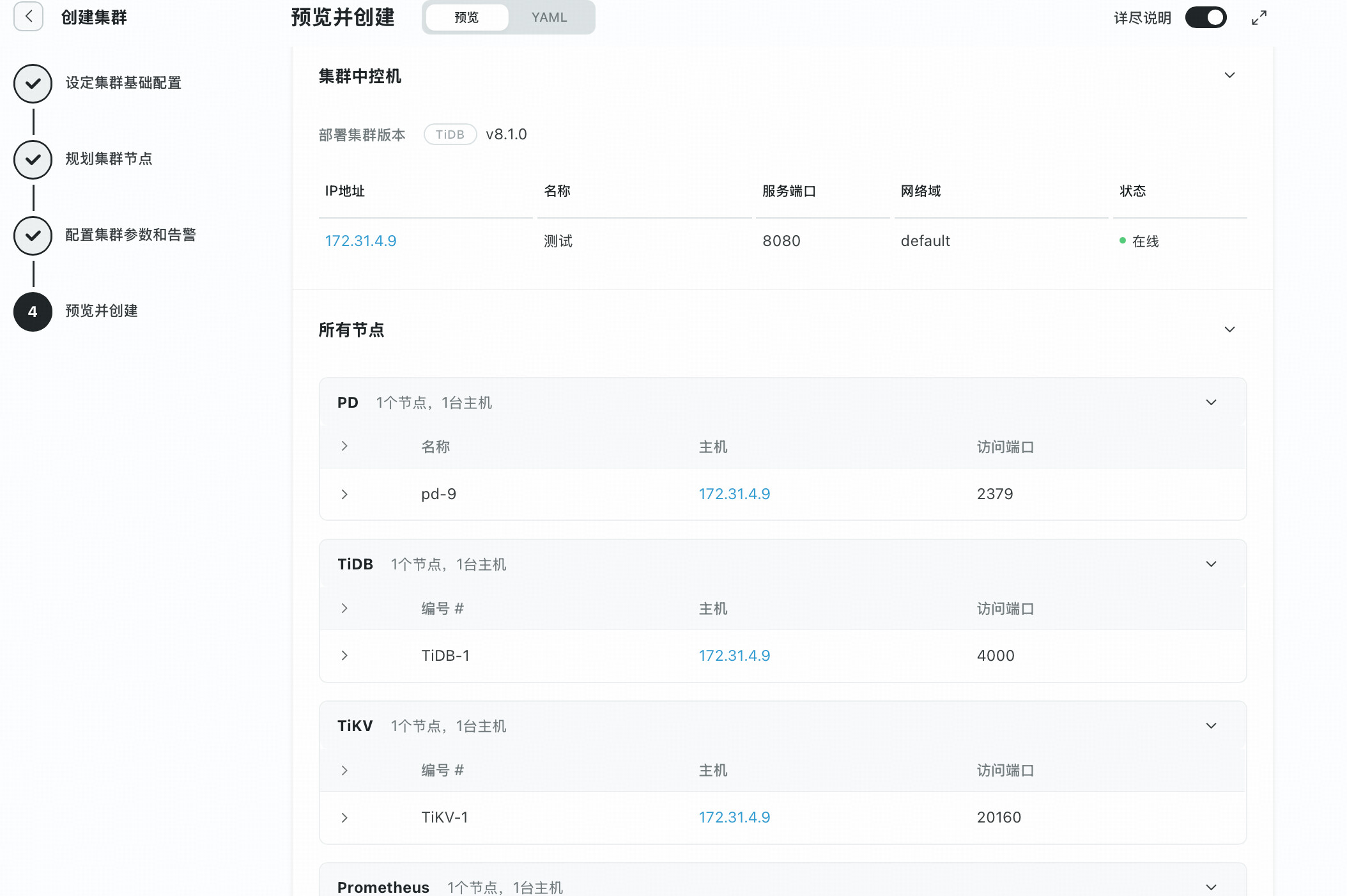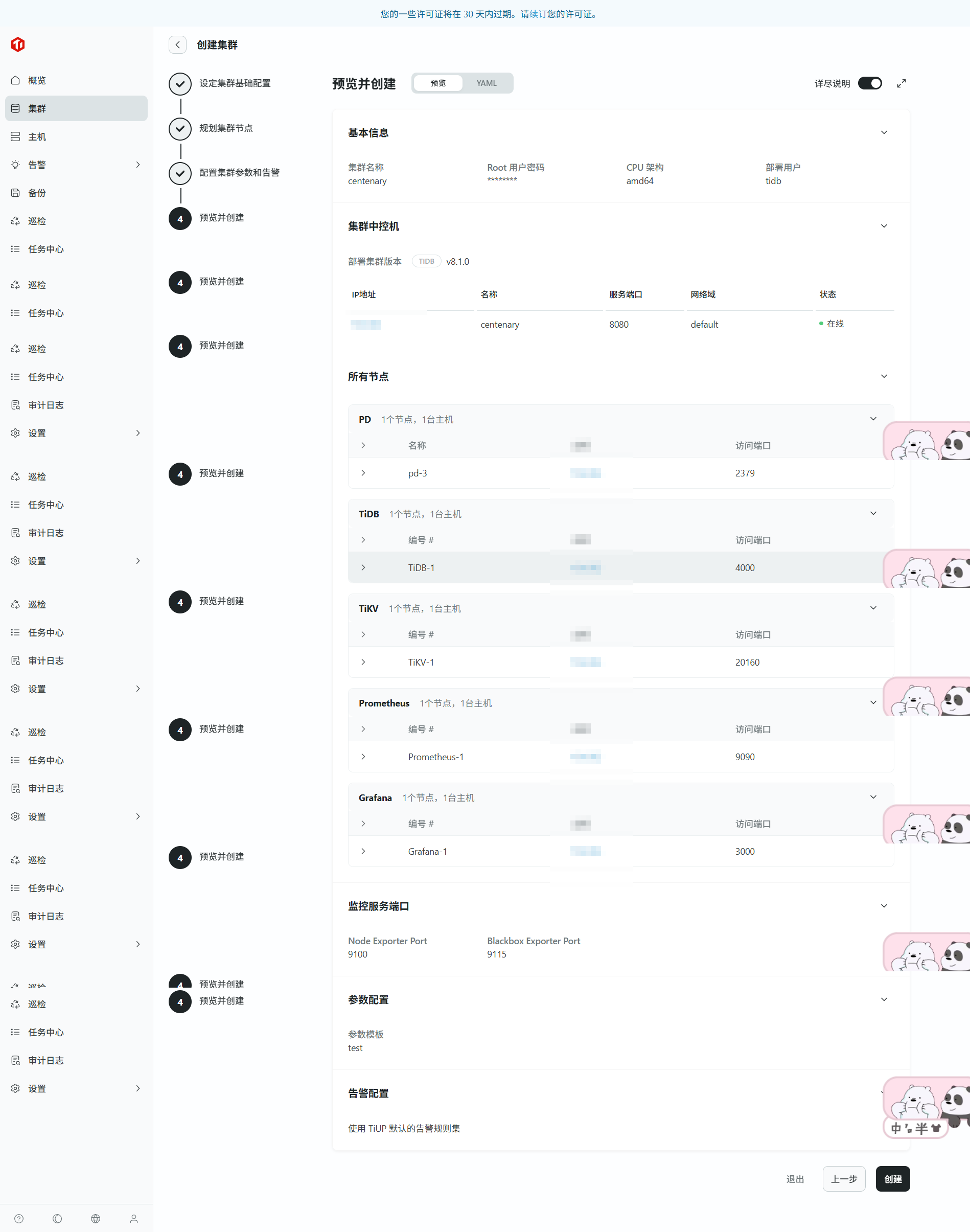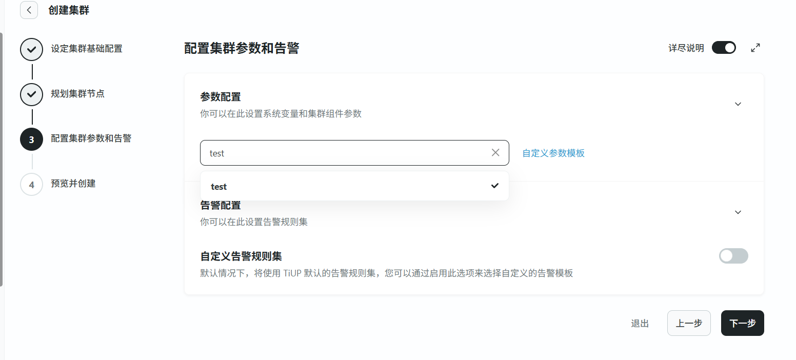 检查无误后,会进入 “配置集群参数和告警” 页面