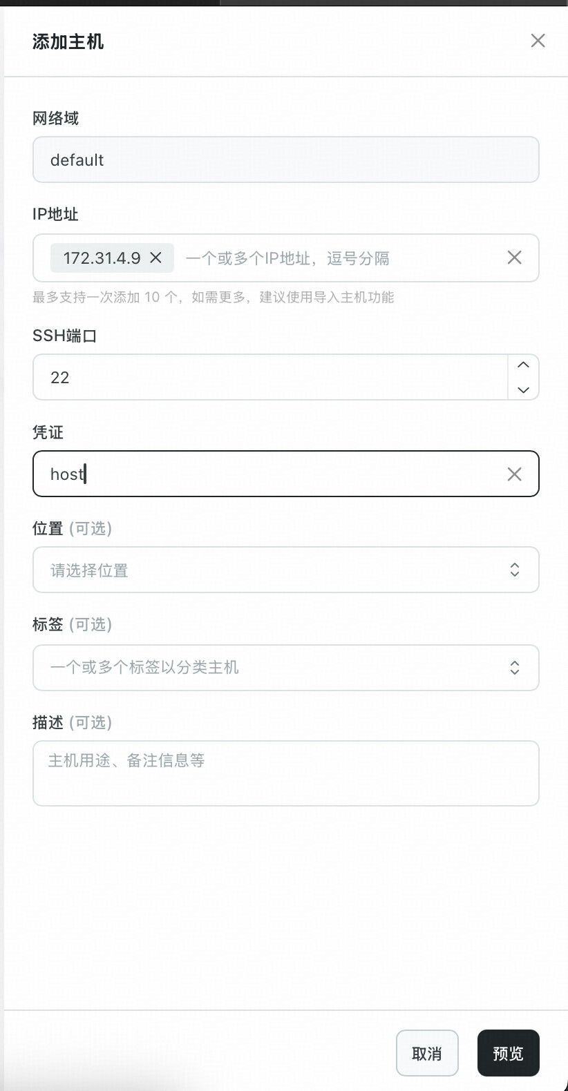 - 填写主机信息,点击“预览”,预览无误后点击“确认添加”