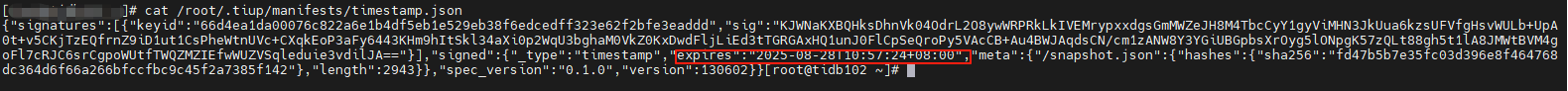 本地的timestamp.json文件里就有过期时间,过了这个时间应该就去https://tiup-mirrors.pingcap.com/timestamp.json更新。