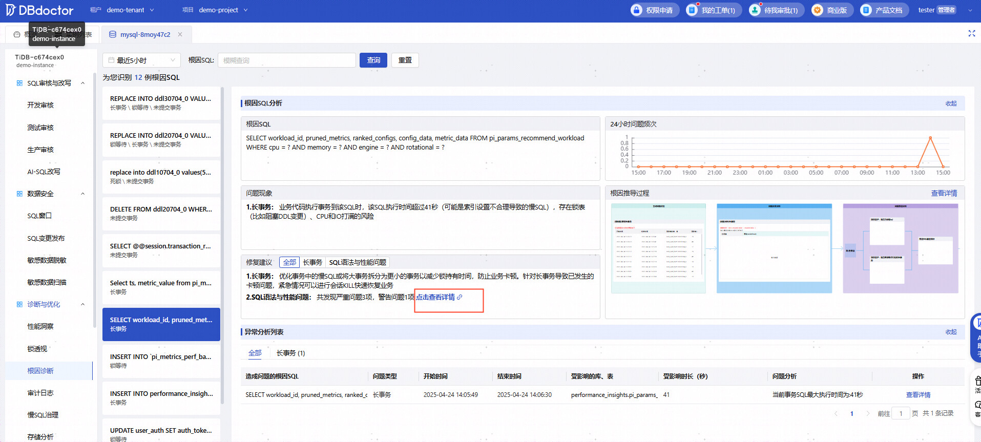 根因诊断中给出跟因SQL分析和修复建议,并且可以查看语法和性能问题。