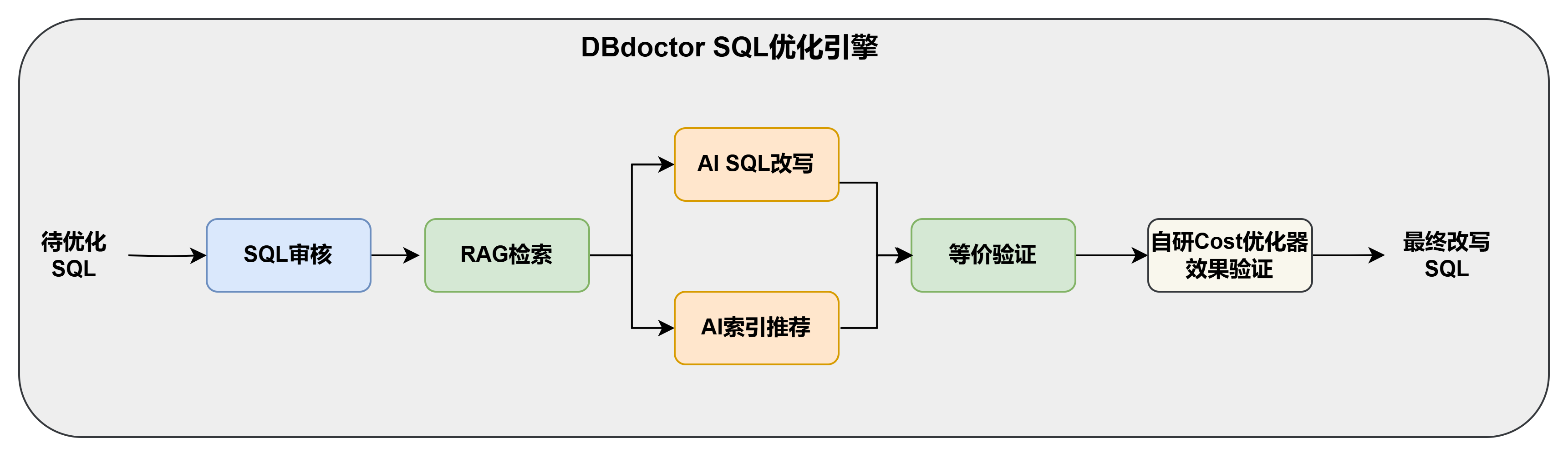 首先经过 DBdoctor SQL审核,对当前SQL进行问题审核 DBdoctor 独家知识库检索,减少大模型幻觉、提升优化与改写效果 AI SQL改写与AI 索引推荐 改写后的SQL语句会经过DBdoctor平台进行等价验证与自研Cost优化器改写效果验证