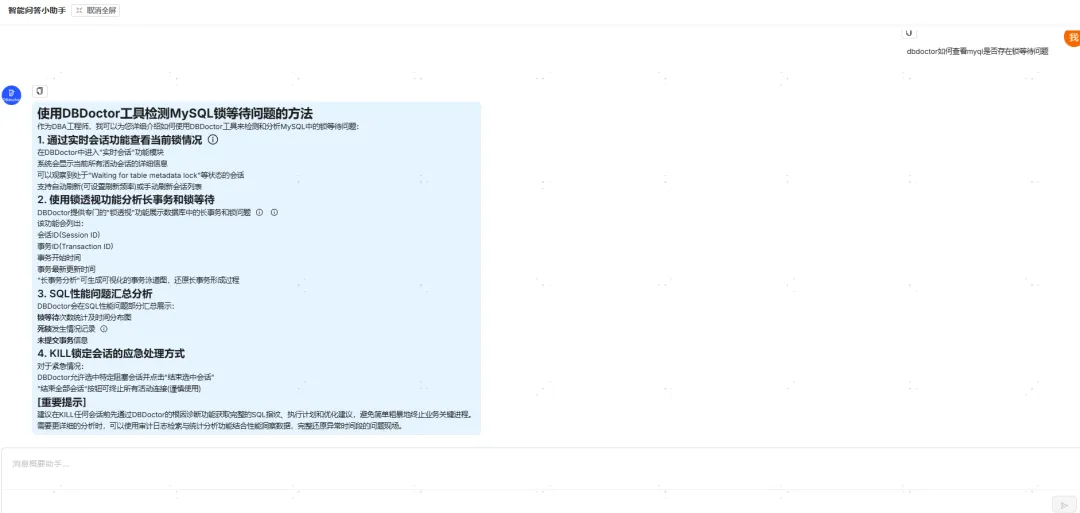 小助手全屏展示,并进一步询问如何在DBdoctor平台上查看锁等待问题。