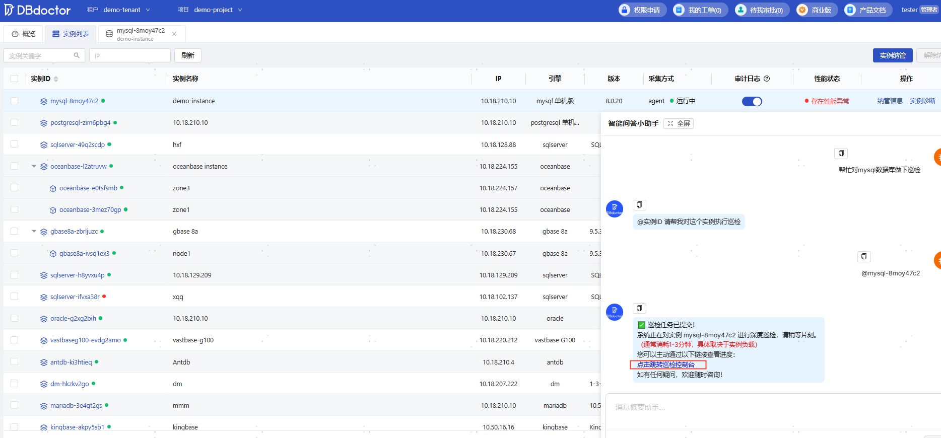 在实例运行状态与风险检查方面,DBdoctor智能小助手如同一位经验丰富的医生,能迅速诊断数据库的“健康状况”。通过与平台数据的紧密交互,用户仅需一句“有哪些数据库存在性能瓶颈?”,它就能依据大模型对系统数据的实时分析,精准筛选出存在性能异常或风险的实例列表。