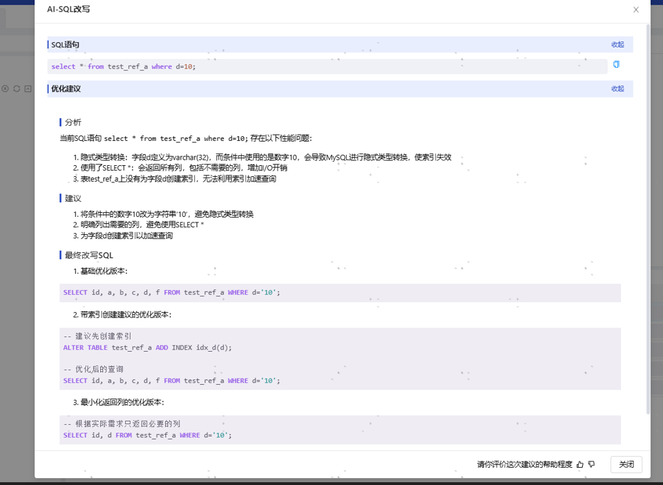 还可以点击查看AI-SQL改写建议进一步进行分析优化。