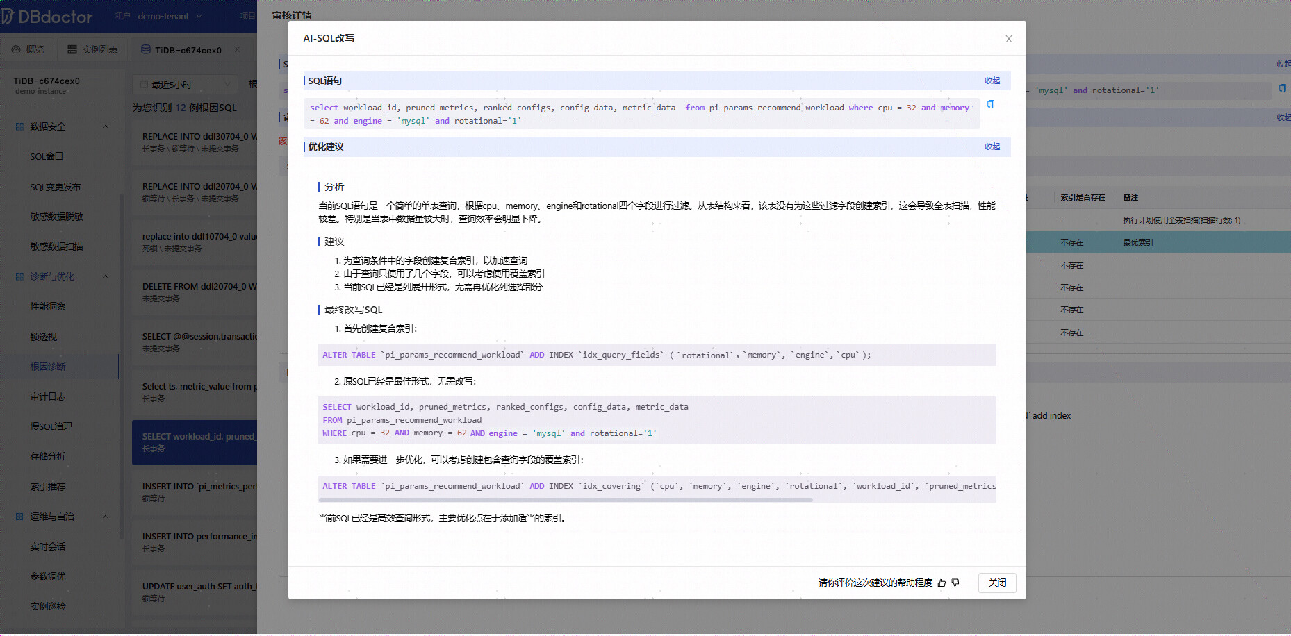 3.面向TiDB的AI SQL优化 用户只需要告诉数据库智能小助手 “帮我在xx数据库下优化xxxSQL”,即可快速调用SQL优化智能体完成SQL优化。