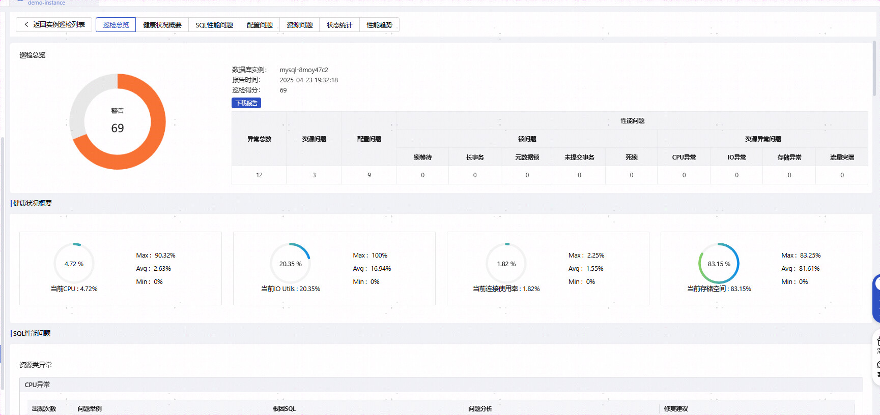 以往,编写复杂的SQL脚本或使用第三方工具进行巡检是一项繁重的任务。现在,智能小助手调用DBdoctor巡检引擎,实现一键自动化巡检。这一过程基于大模型对各类数据库参数和运行状态的理解,能够全面检查参数配置、实例负载、SQL执行效率、锁分析等关键指标,并以可视化报告呈现结果。这种智能化的巡检方式,不仅减少了人工操作的失误,还提高了巡检的频率和准确性,确保数据库始终处于最佳运行状态。图片