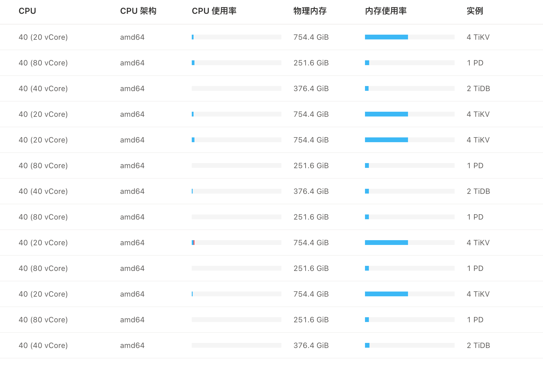 一个物理机的规格是 80C 768G 4 * 3.84Tnvme,运行了 4 个 TIKV 节点,都做了 NUMA 绑定和 CORES 绑定。