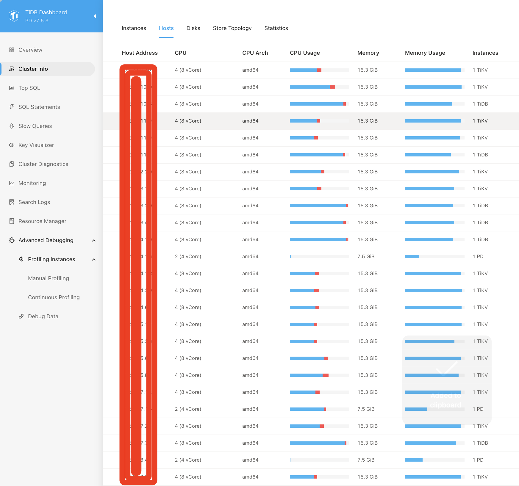 【资源配置】进入到 TiDB Dashboard -集群信息 (Cluster Info) -主机(Hosts) 截图此页面