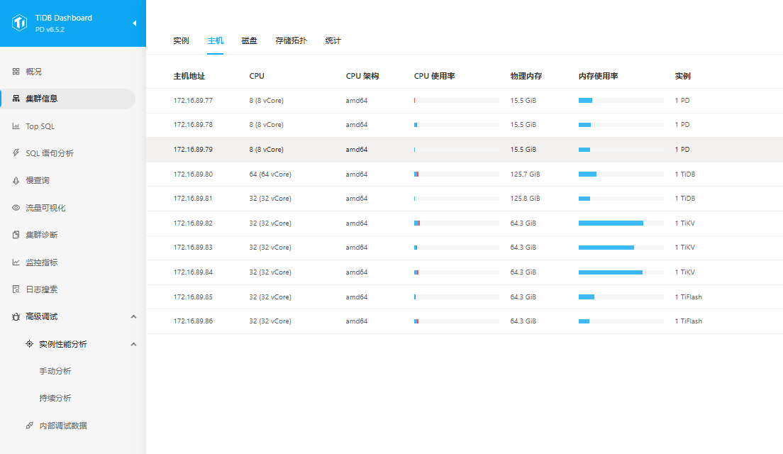 【资源配置】进入到 TiDB Dashboard -集群信息 (Cluster Info) -主机(Hosts) 截图此页面