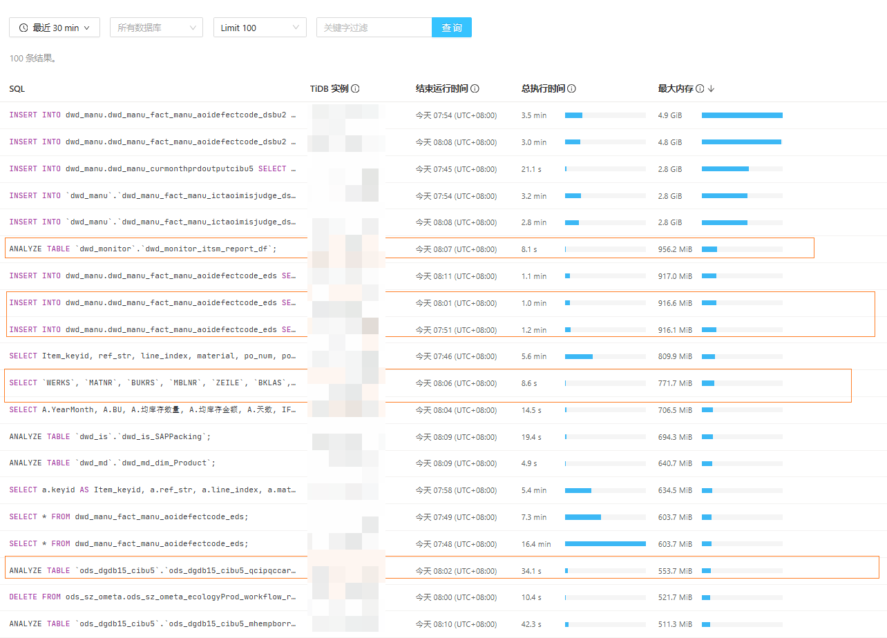 最近半个小时 各个TiDBServer 节点占用内存大Sql 如下,占用内存高的Server 节点 没有太大差异