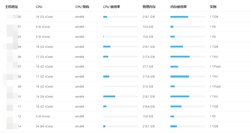 【资源配置】进入到 TiDB Dashboard -集群信息 (Cluster Info) -主机(Hosts) 截图此页面