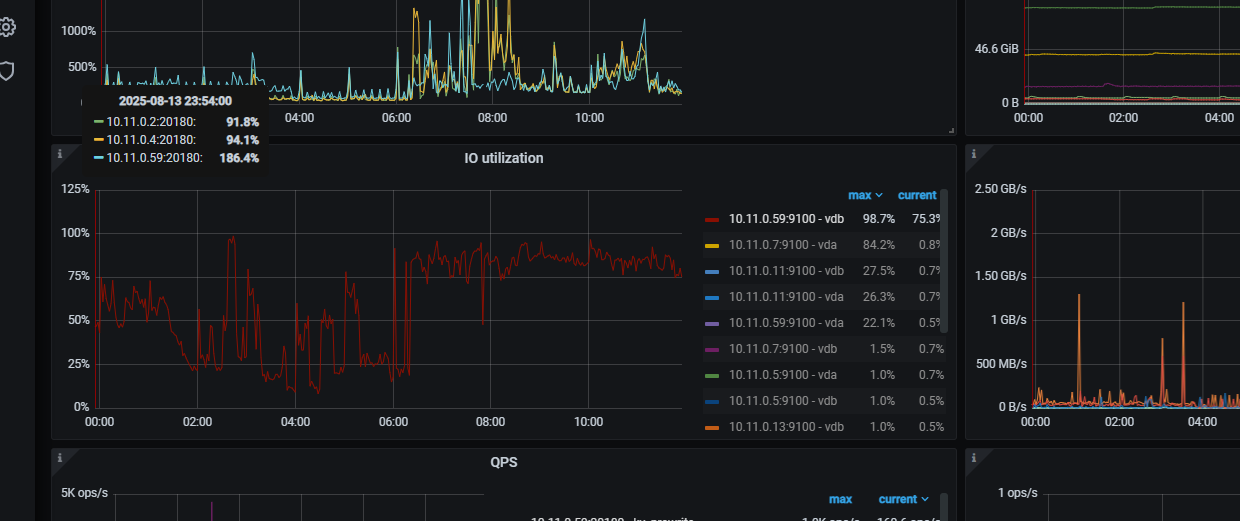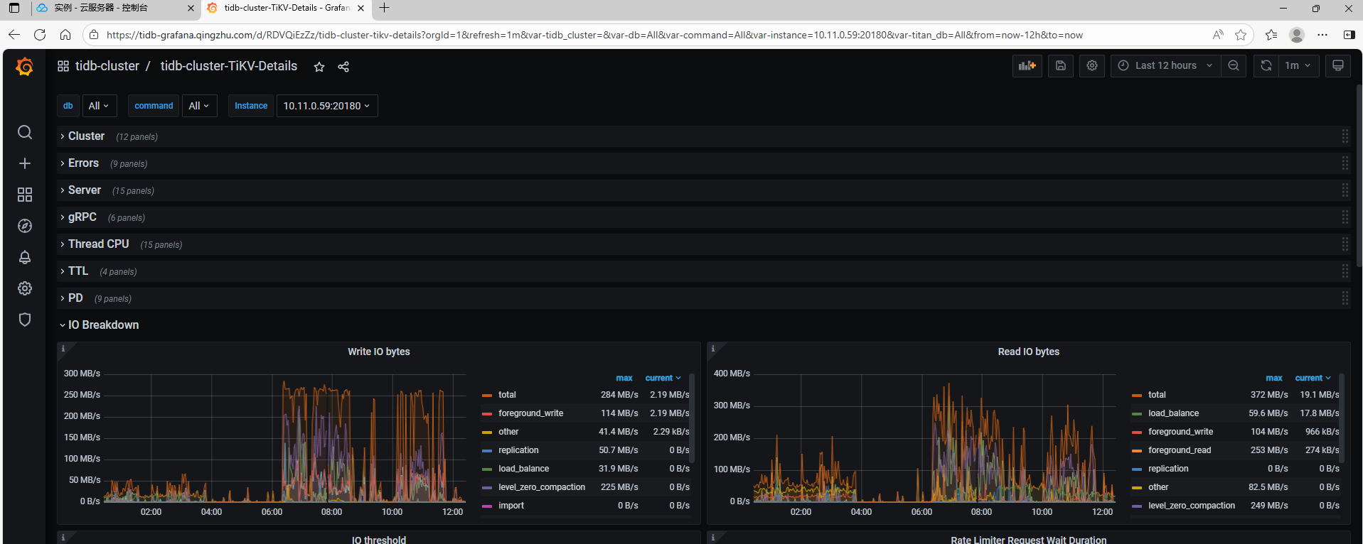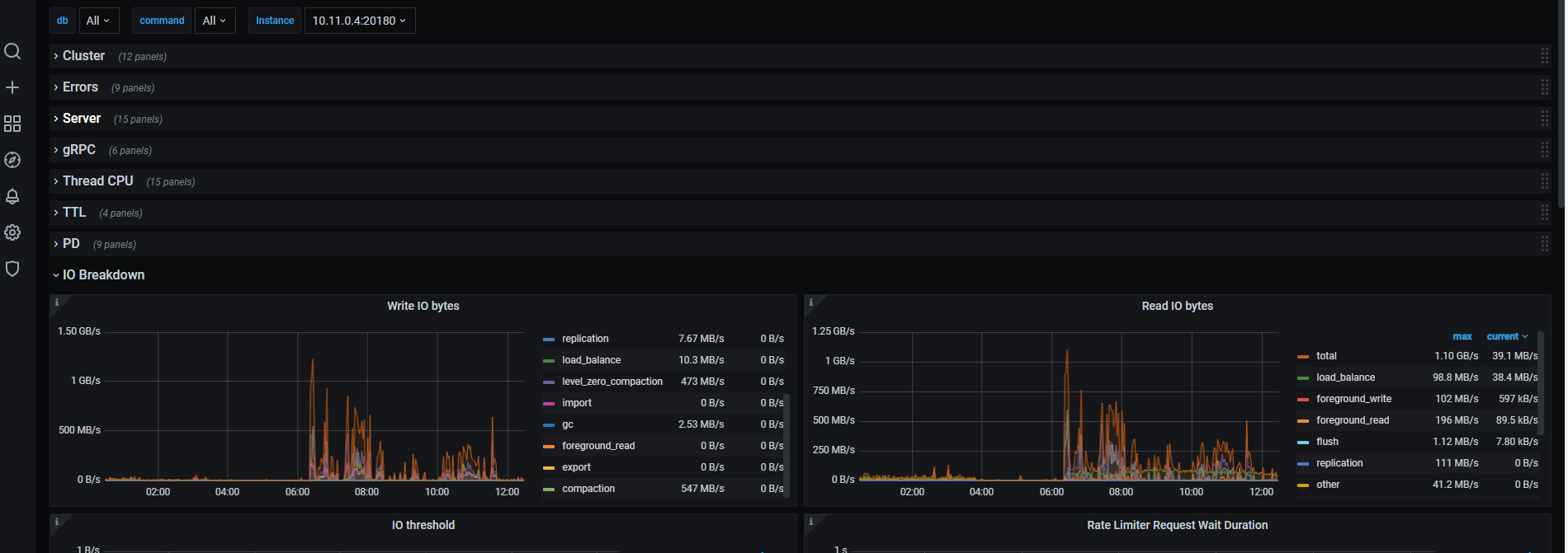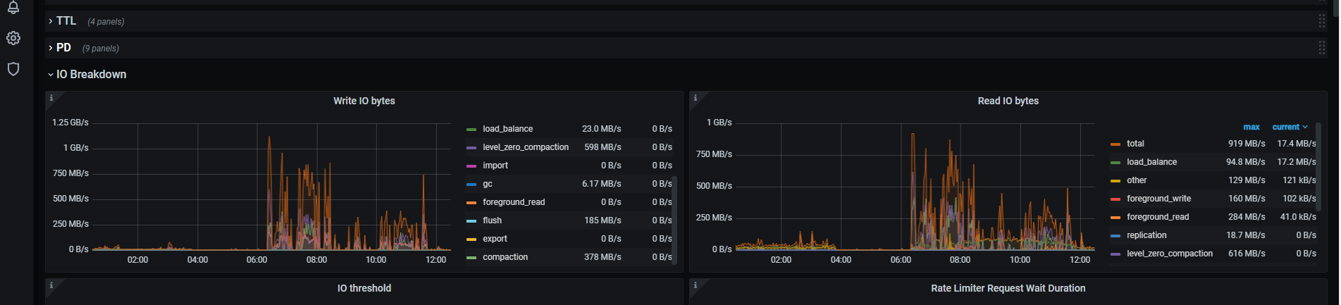对,看看各个 tikv 的 IO 是否正常。在那个峰值时间周期内